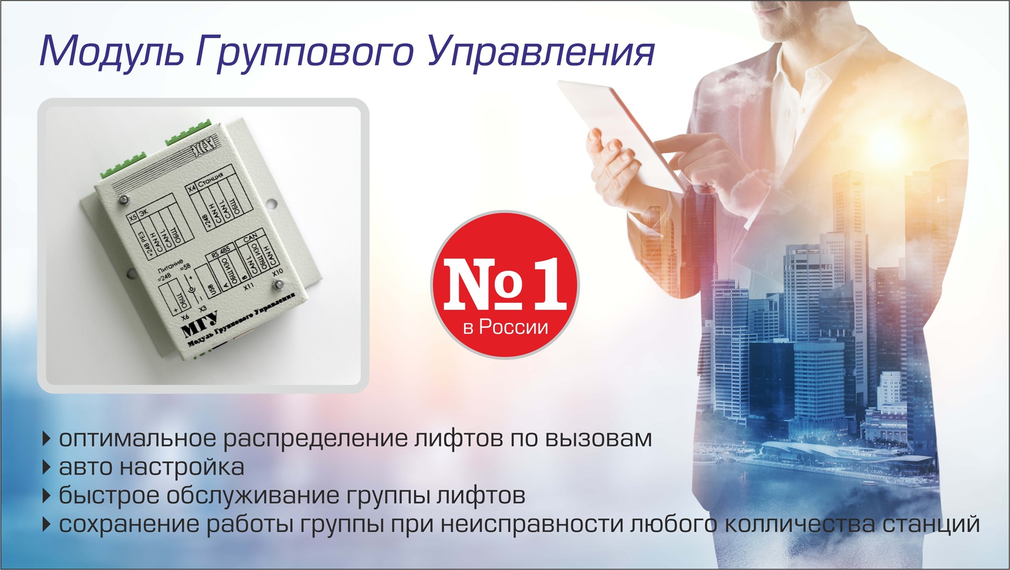 Модуль группового управления (МГУ) предназначен для управления лифтовыми станциями «СОЮЗ-М» и «СОЮЗ-БМ», организованными в группу.